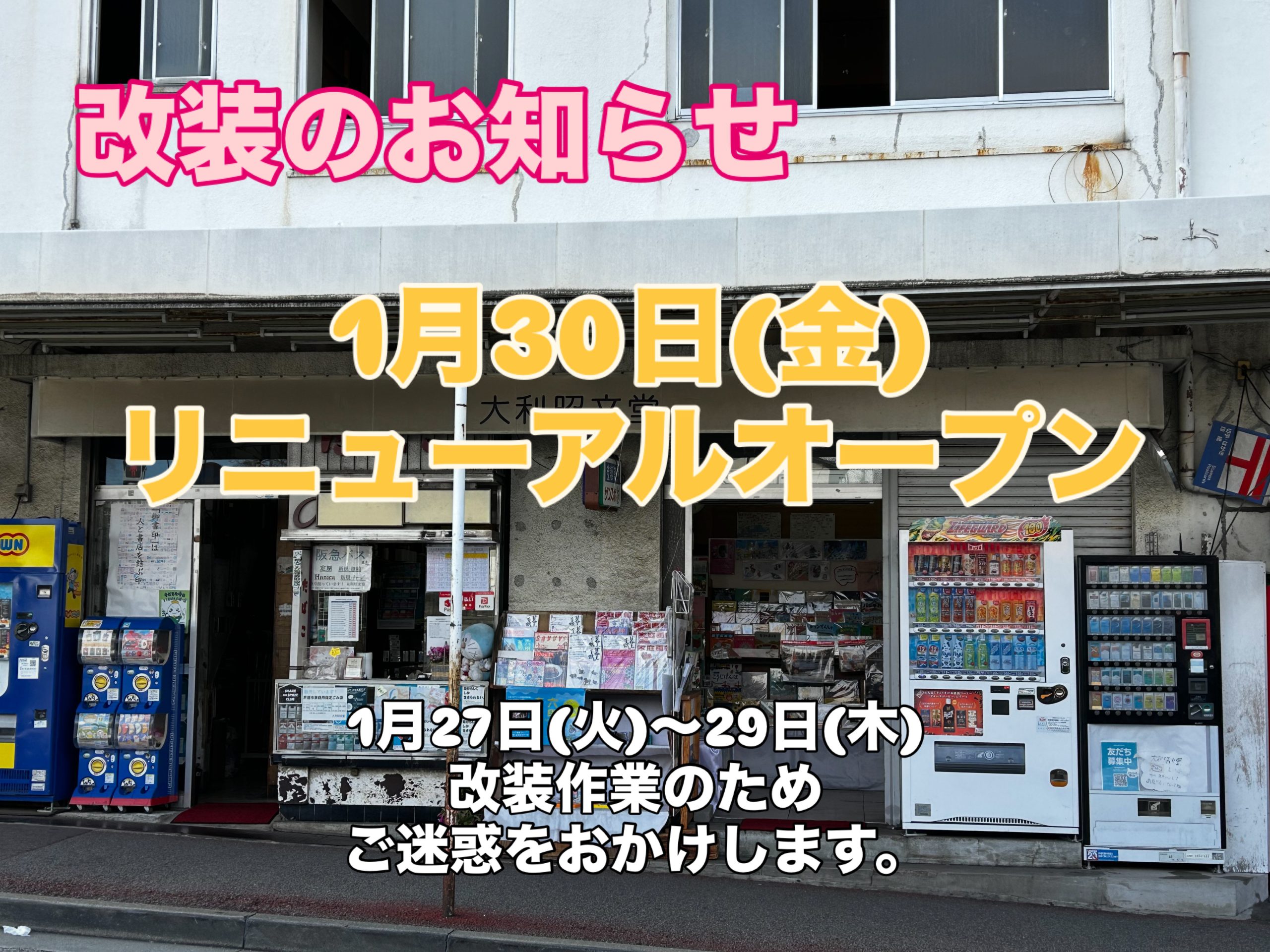 店舗改装のお知らせ 1月27日(火)~29日(木)まで店舗改装のため窓口のみの営業となります。 ご迷惑をおかけいたしますが、よろしくお願いいたします。 改装作業の修了したところはご入店いただけます。 1月30日(金)リニューアルオープン! 大利昭文堂の中にポップアップショップがオープン あの「好日山荘」さんがやってきます🏔 楽しみにしていてくださいね❣ ← 1月営業予定